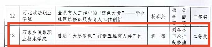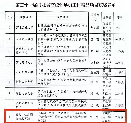 近日,河北省教育厅公布了第二十一届河北省高校思想政治工作成果评选结果。我院申报的《涵养“四种精神”精育铁路匠才》获河北省高校校园文化建设优秀成果一等奖;《善用“大思政课”打造五维育人共同体》获河北省高校思想政治创新案例二等奖;《“五心”共育 互动融合——高职院校“情-知-行”浸润式心理育人模式探索与实践》获河北省高校辅导员工作精品项目二等奖。